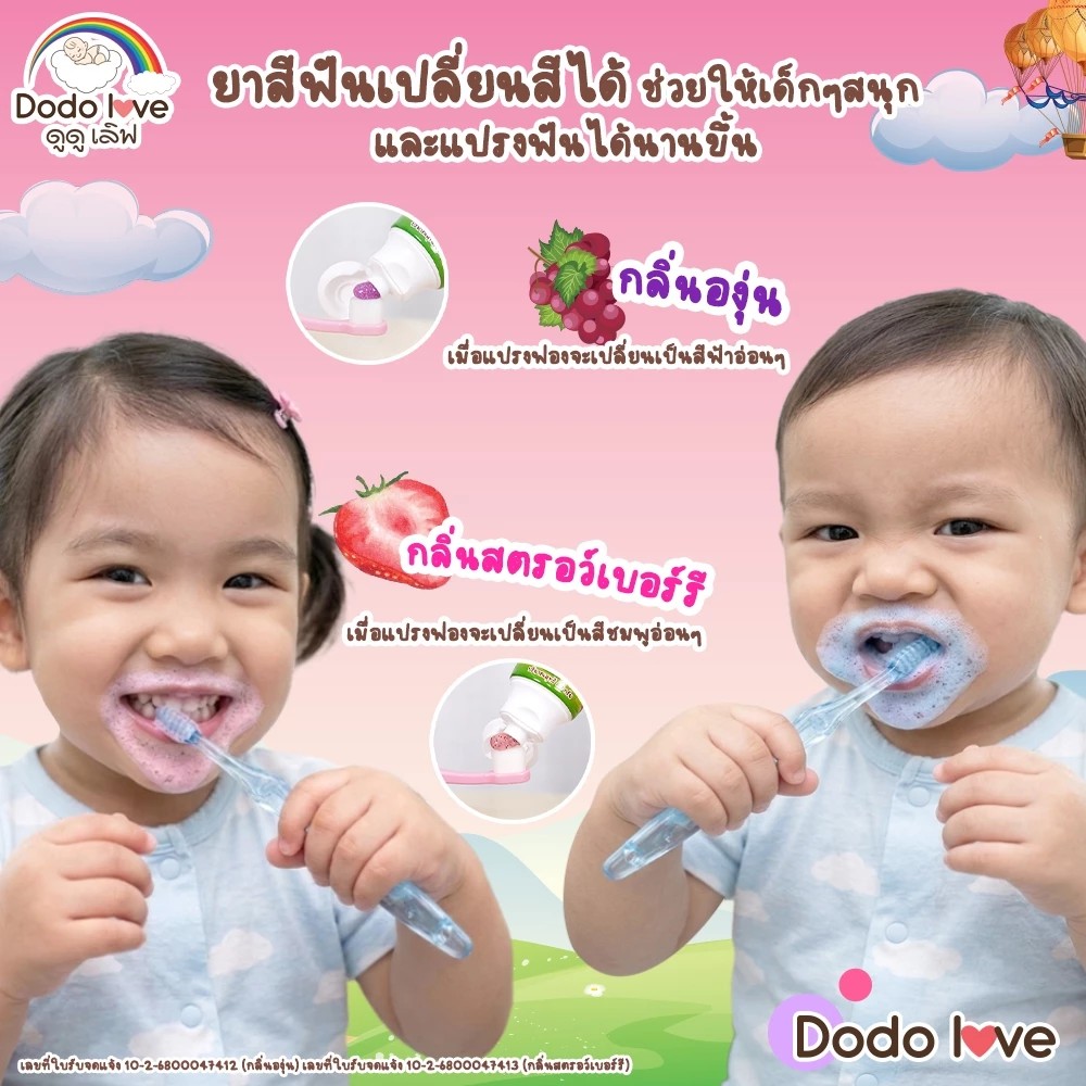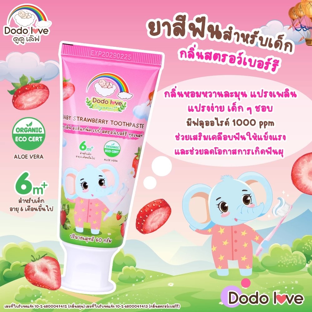 DODOLOVE ยาสีฟันเด็ก ยาสีฟันเนื้อเจล กลิ่นผลไม้ มีฟลูออไรด์ สูตรออร์แกนิค (60กรัม)