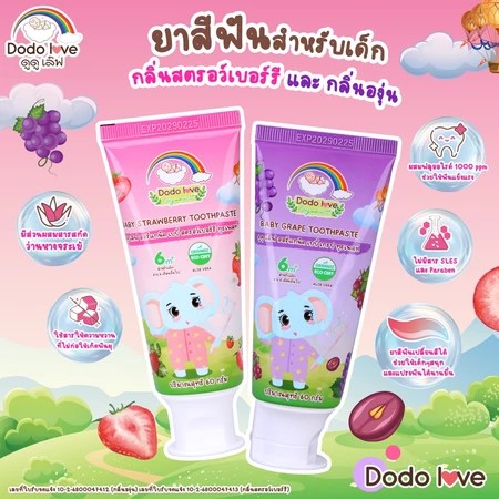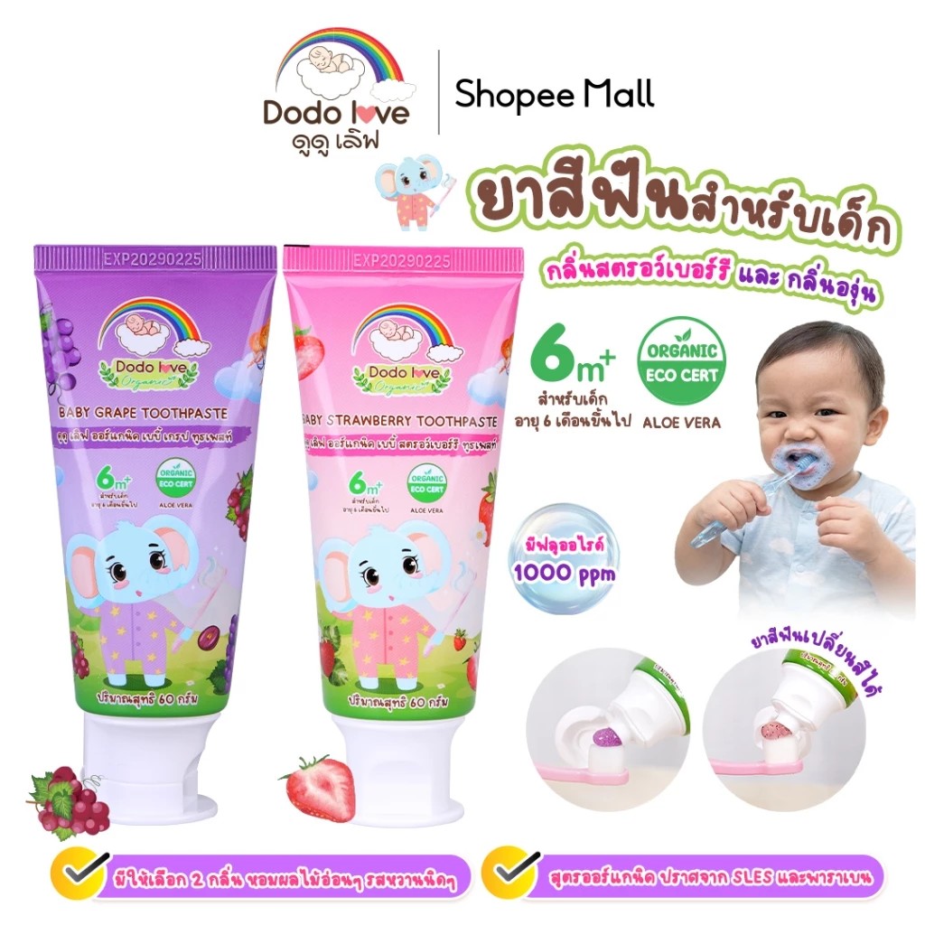 ดูดู เลิฟ ออร์แกนิค เบบี้ ทูธเพสท์ ยาสีฟันสำหรับเด็ก 2 กลิ่น กลิ่นผลไม้ องุ่นและสตรอว์เบอร์รี ช่วยป้องกันฟันผุอย่างมีประสิทธิภาพด้วยฟลูออไรด์ในปริมาณที่เหมาะสม เสริมสร้างความแข็งแรงให้ฟันน้ำนม พร้อมไซลิทอล สารให้ความหวานจากธรรมชาติที่ไม่ก่อให้เกิดฟันผุ เหมาะสำหรับเด็กวัย 6 เดือนขึ้นไป
