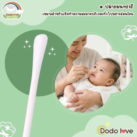 - หัวสำลีเรียวเล็ก เหมาะสำหรับรูหูและจมูกที่เล็กและบอบบางของทารก